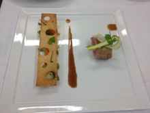 « Médaillon de veau, jus corsé, petits légumes croquants, asperges vertes étuvées et mousse légère »