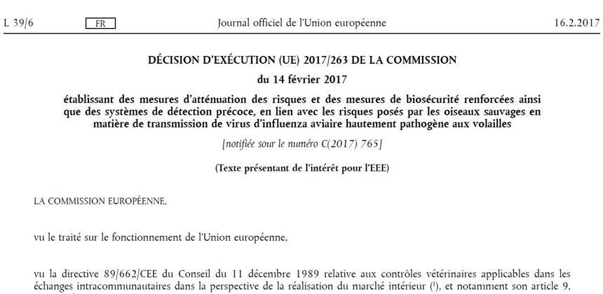 GRIPPE AVIAIRE L’Europe complète la liste des mesures de précaution