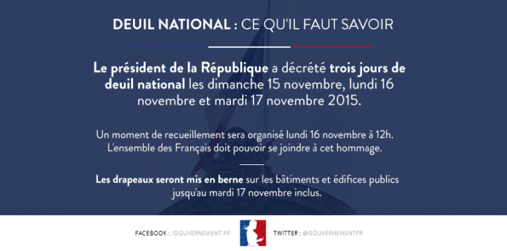 Le président de la République a décrété trois jours de deuil national à la suite des attentats commis à Paris vendredi 13 novembre 2015.