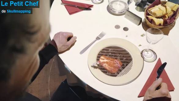 Vous êtes attablés dans un restaurant quand un Petit Chef virtuel vient vous rendre visite. Cette projection vidéo signée Skullmapping basée à Louvain (Belgique) utilise des animations 3D pour donner vie à ce petit chef qui vient dans votre assiette pour la transformer en terrain de jeux… brûlants. Peut-être un futur moyen de faire patienter les enfants au restaurant.